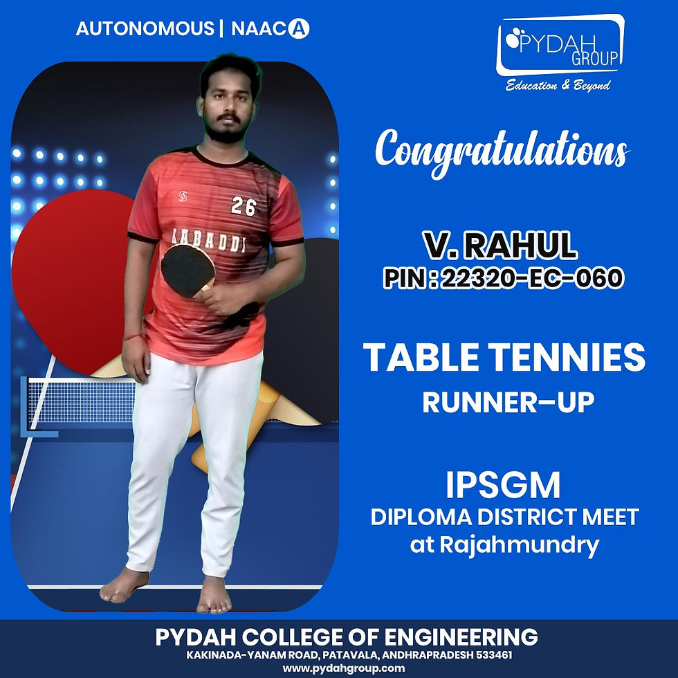 Huge congratulations to our talented student, V Rahul , from Diploma Electronics Engineering, for securing 2nd place in Table Tennis at the IPGSM District Meet held at Rajahmundry!
